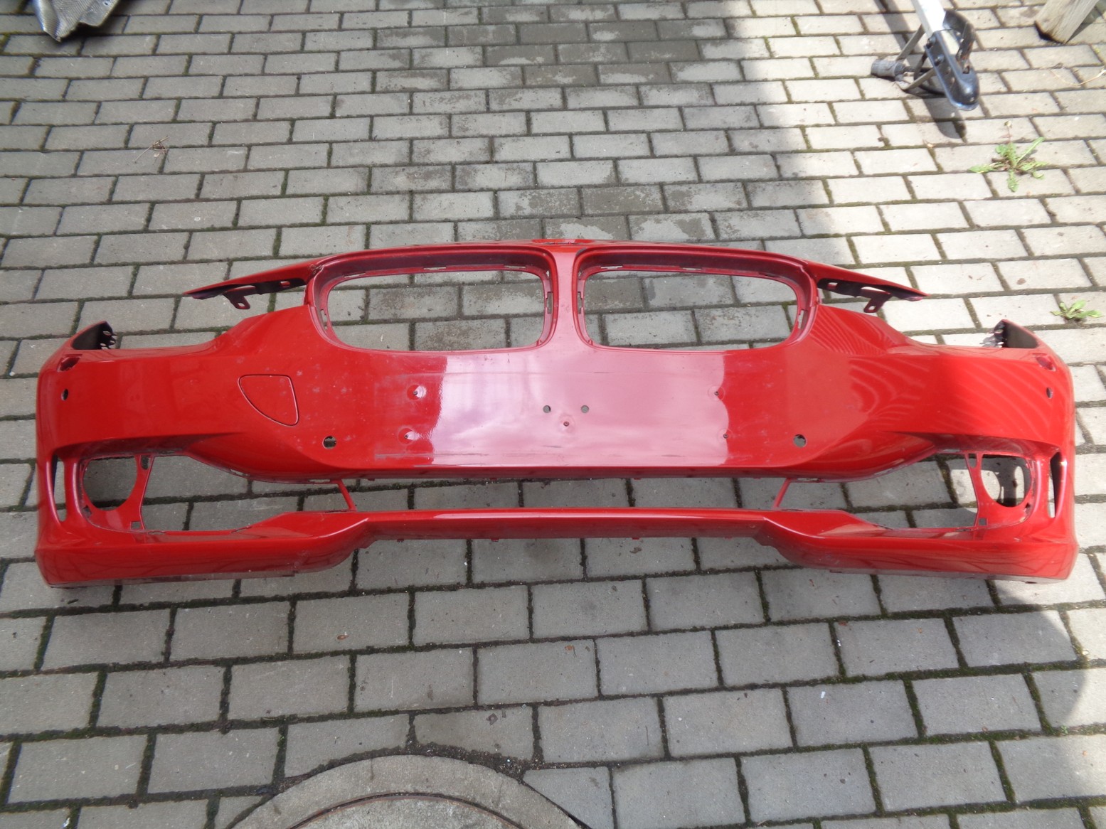 Přední nárazník na BMW F30, verze Basis, otvory na ostřikovače a PDC, červený, silně odřený levý bok, žádná prasklina. Současné originál číslo 51117292999.