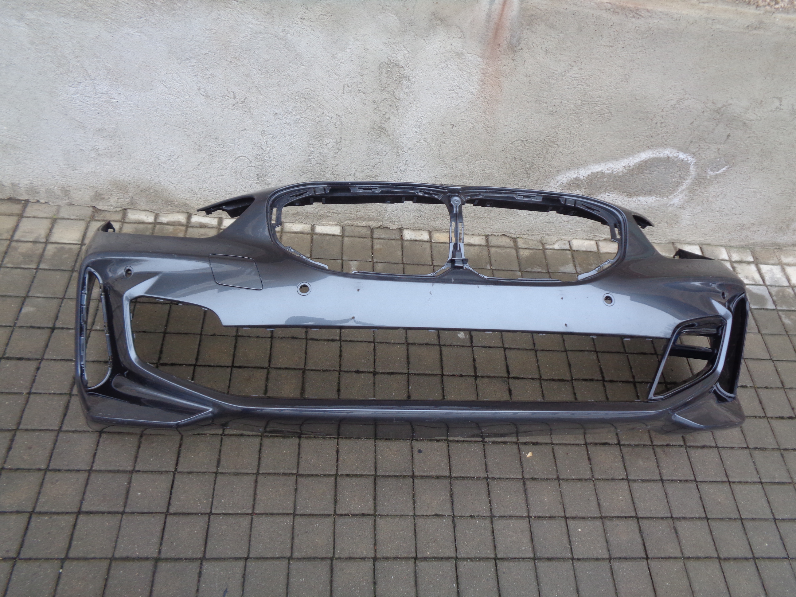 Přední nárazník M-paket na BMW 1 F40, 4x otvor na PDC, barva šedá, odřený levý bok. Současné orig. číslo 51119881566. Levá mřížka mlhy 500kč.