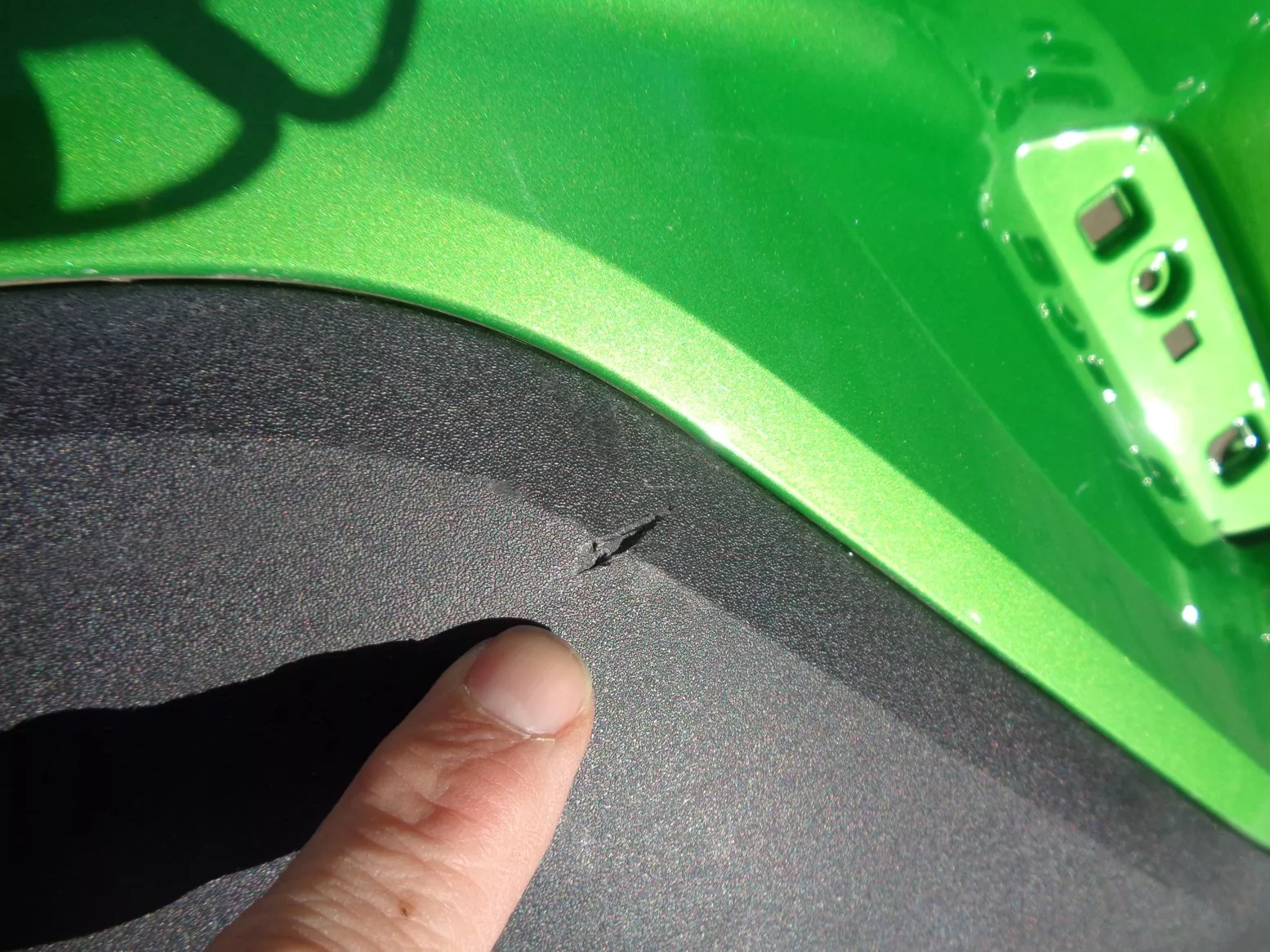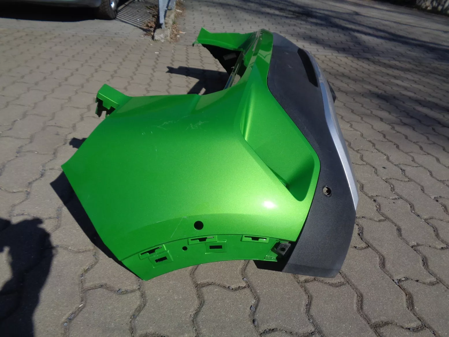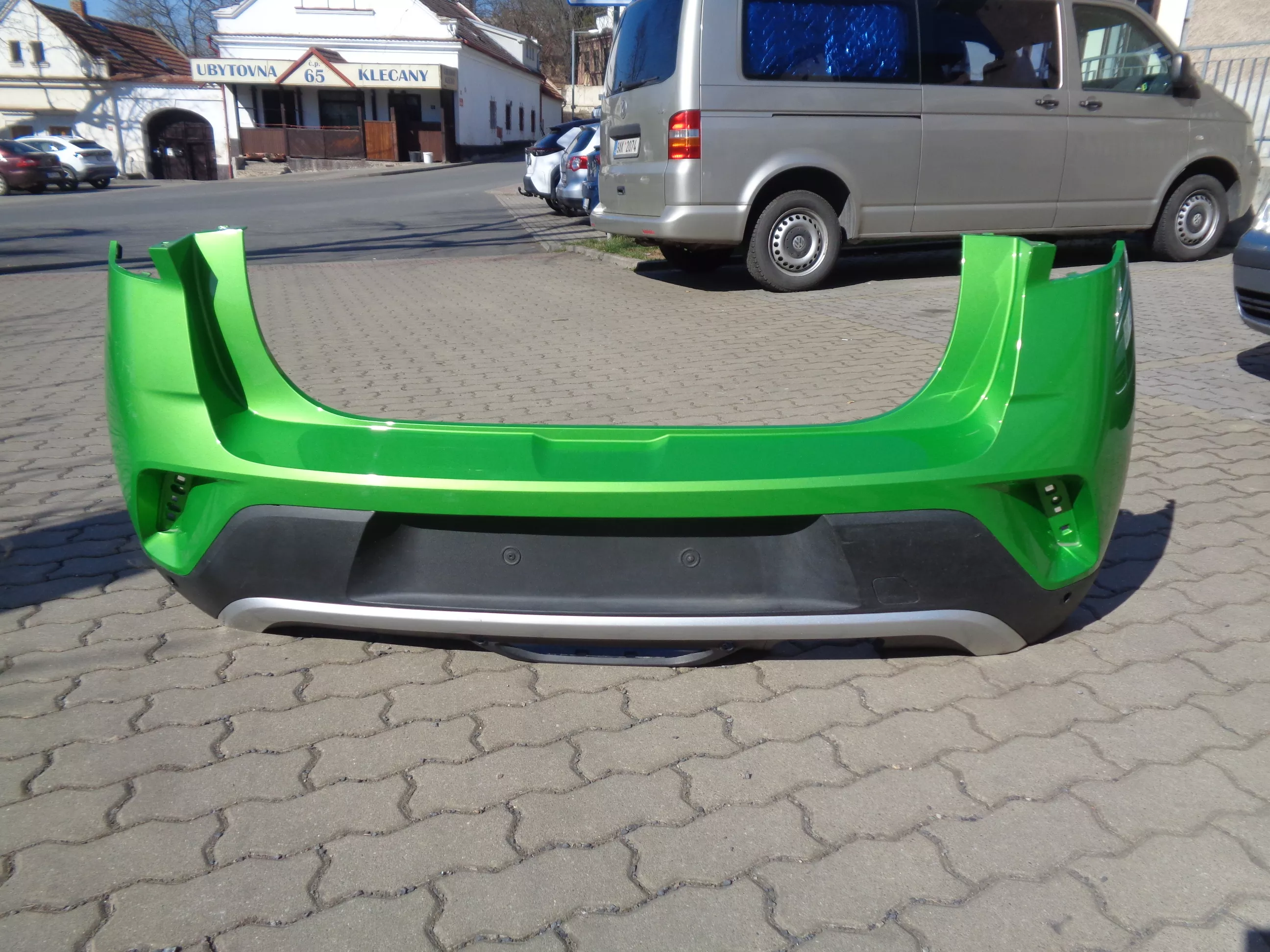 Zadní nárazník na opel Mokka (od r.v. 10/2020-), zelený, 6 otvorů na čidla, malá rýha v černém plastu a škrábance laku na levém boku.