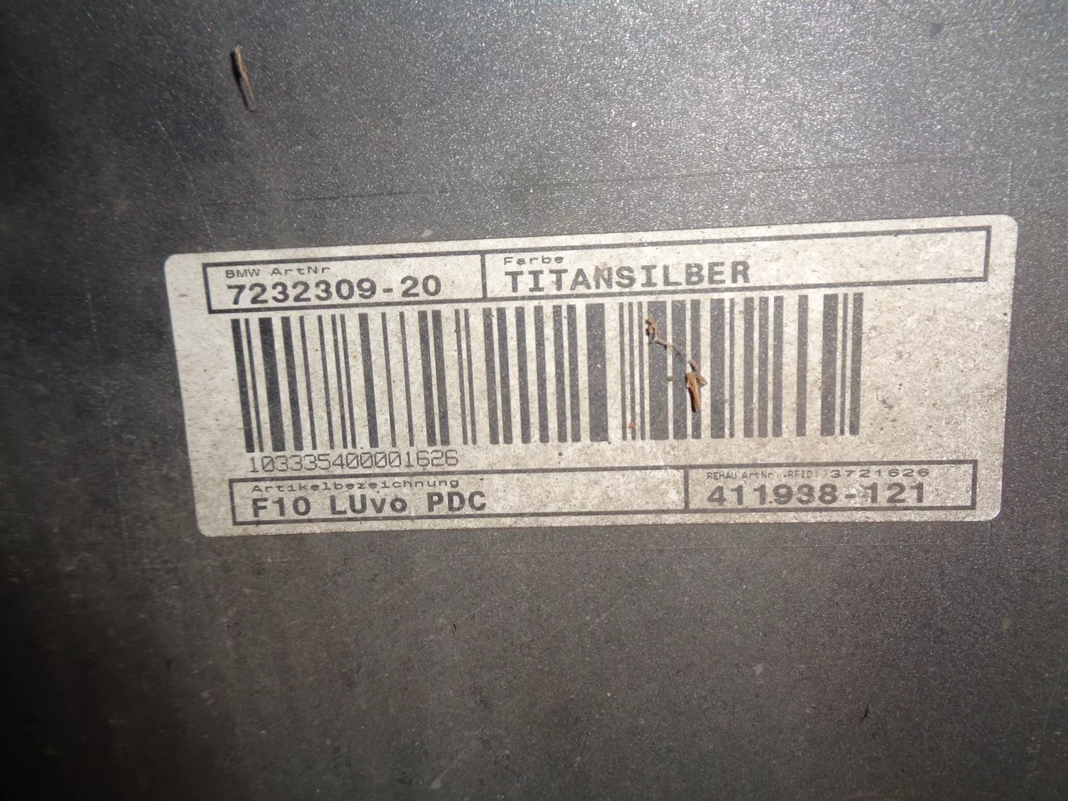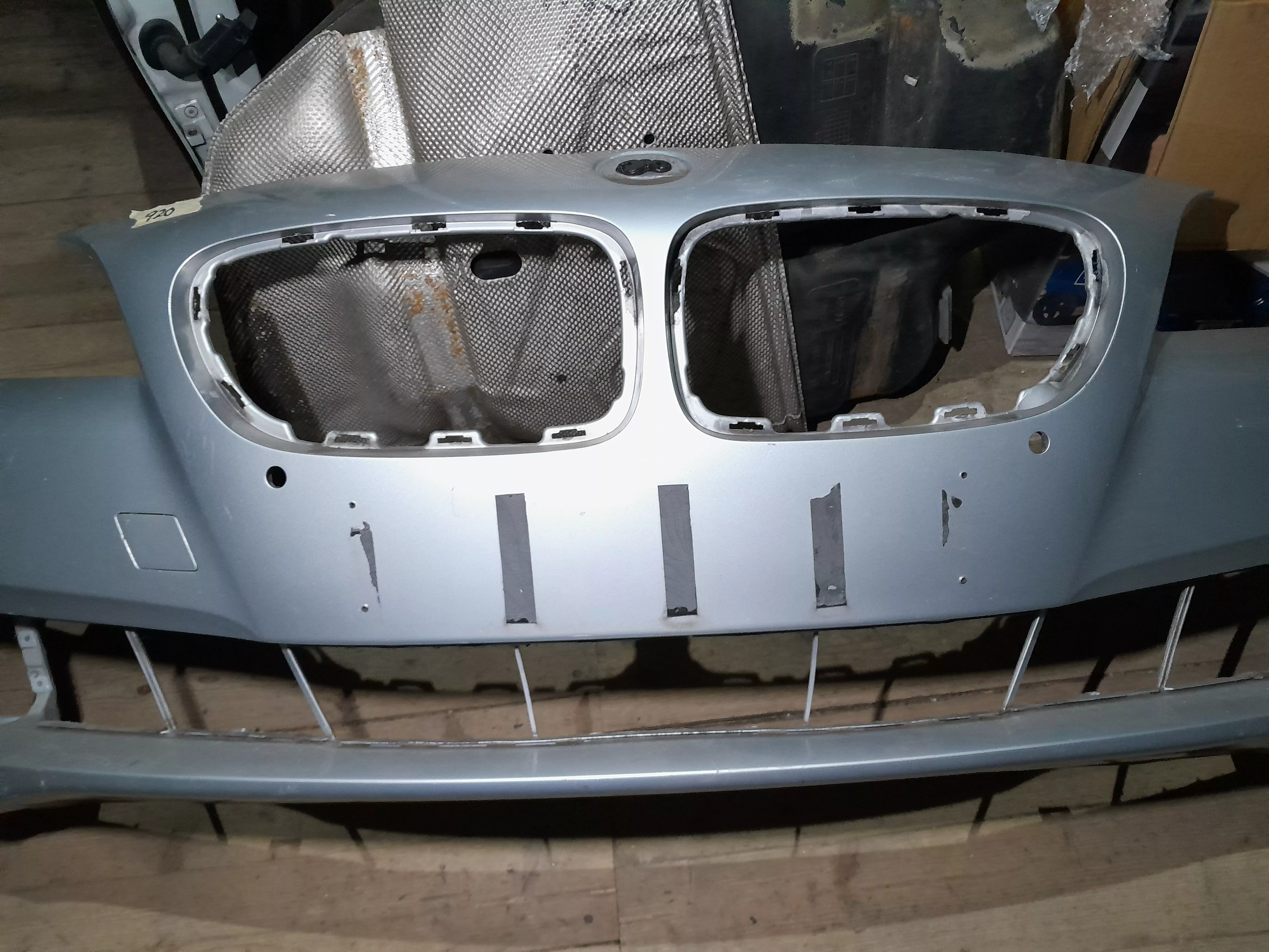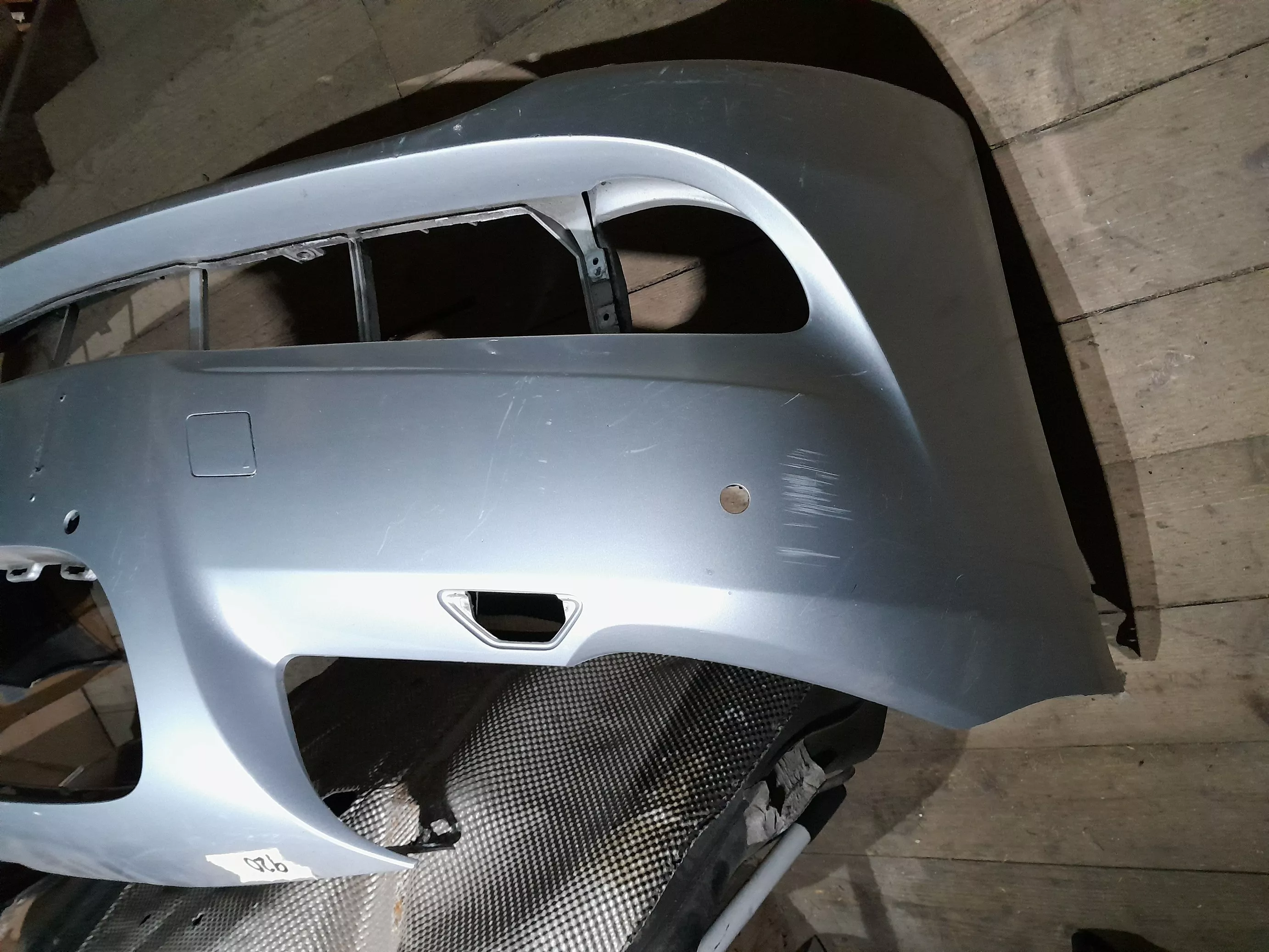 Přední nárazník na BMW 5 F10 s otvory na ostřikovače a PDC, stříbrný - Titansilber, jen škrábnutý lak nad pravou mlhovkou. Současné originál číslo 51117285961.