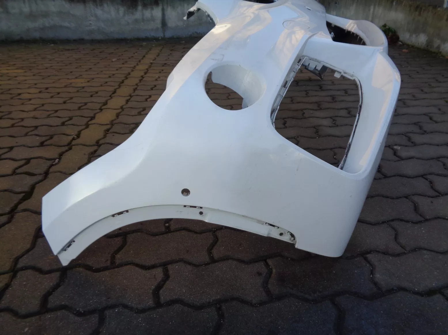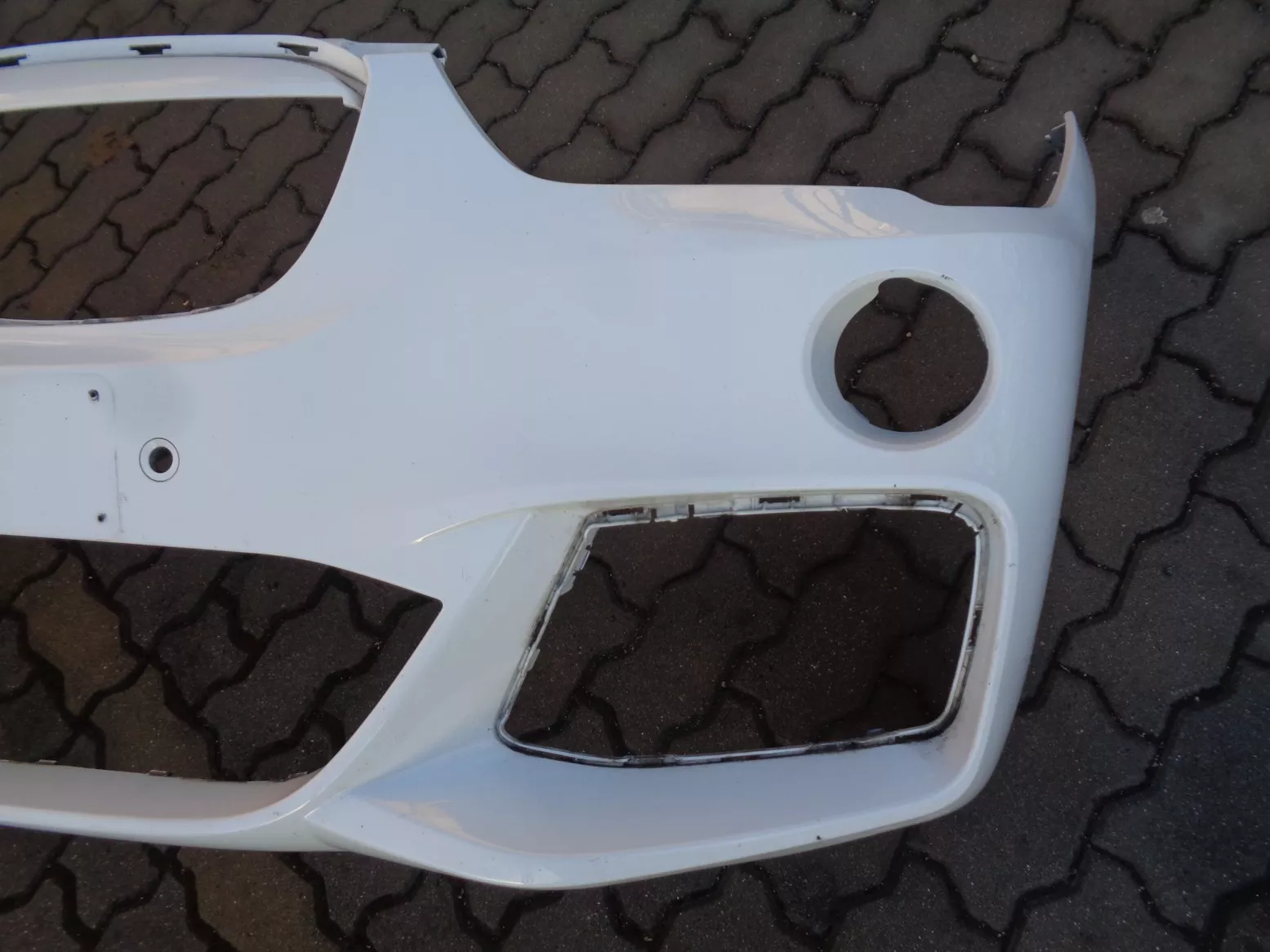 Přední nárazník M-paket na BMW X1 F48, bílý, otvory na PDC a PMA, poškozen na pravém boku a malá prasklina na horní hraně pod pravým světlem. Současné originál číslo 51118072771.