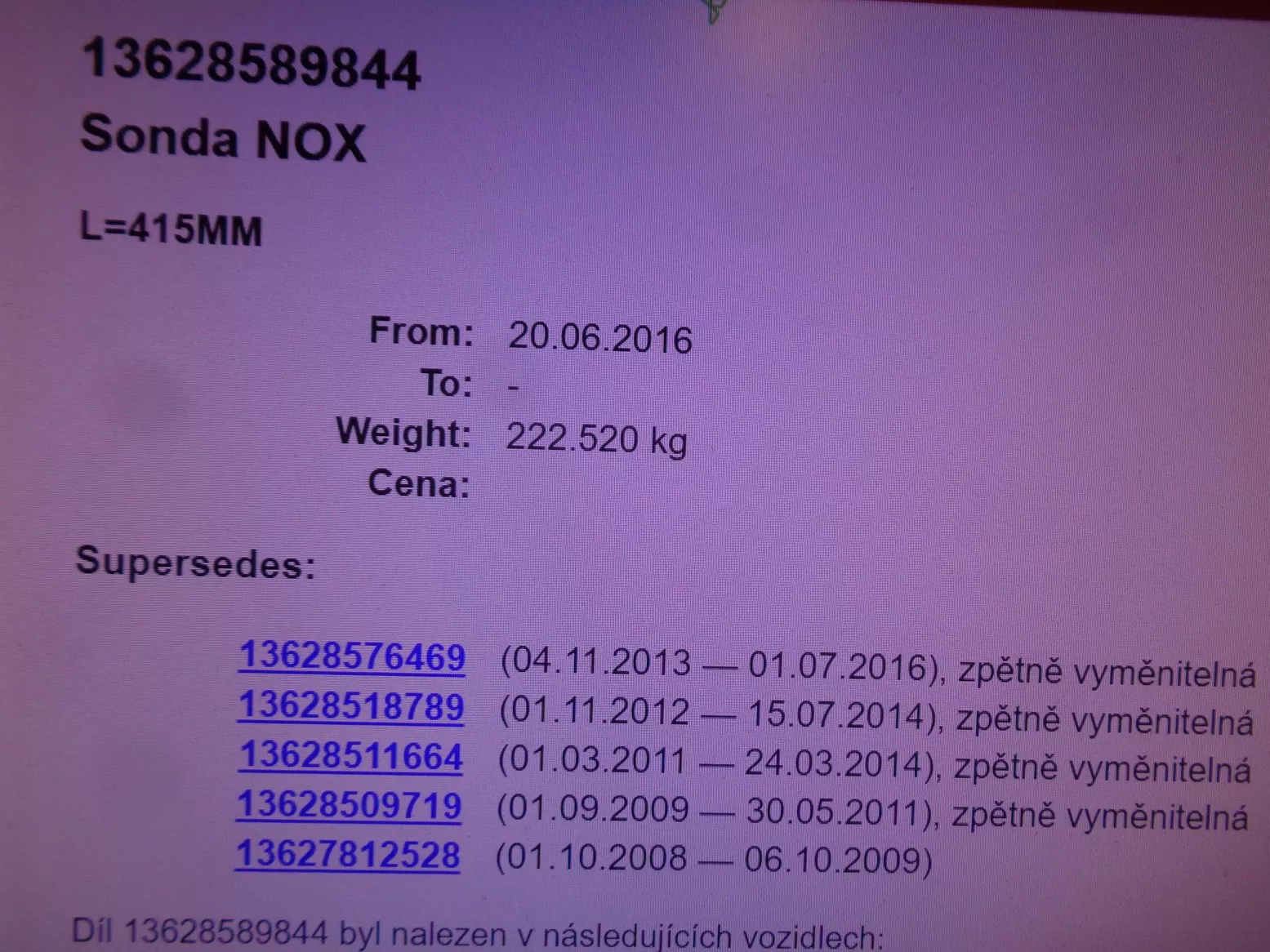 Čidlo NOx na BMW 1,2 F20/21/22/23LCI - motory B47, BMW 7 F01- motory N57, X5 E70LCI - N57, X5 F15 a X6 F16 - motory B47, N47S1, N57N, N57Z a N57X.