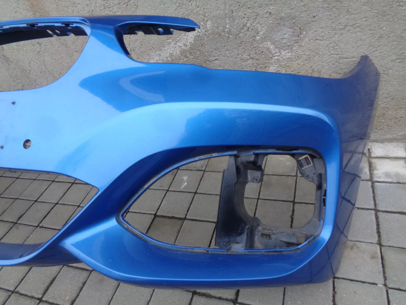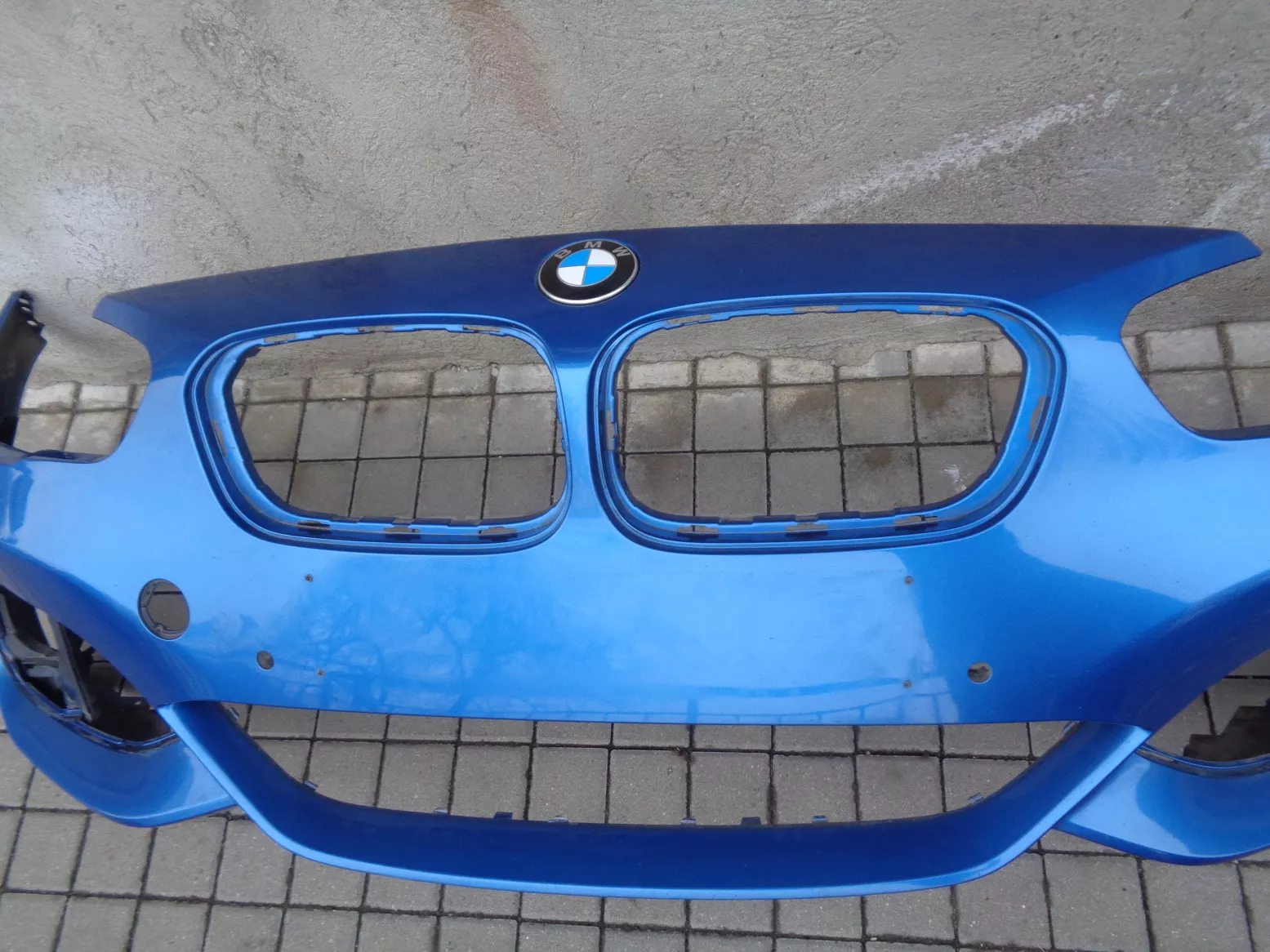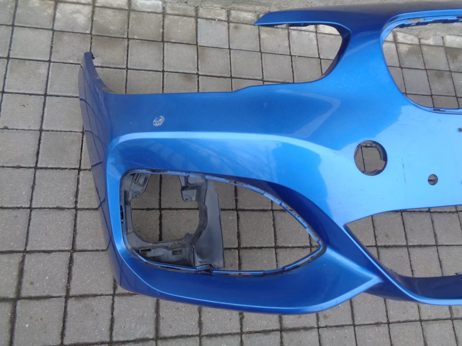 Přední nárazník M-paket na BMW 1 F20 facelift s otvory na PDC, modrý, pěkný stav, jen poškozen lak pod pravým světlem. Současné originál číslo 51118064581.