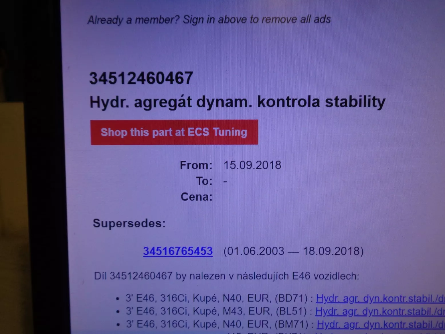Hydraulický agregát DSC na BMW 3 E46 facelift, číslo na jednotce 34516759047 / 34516759045, současné orig. číslo 34512460467.