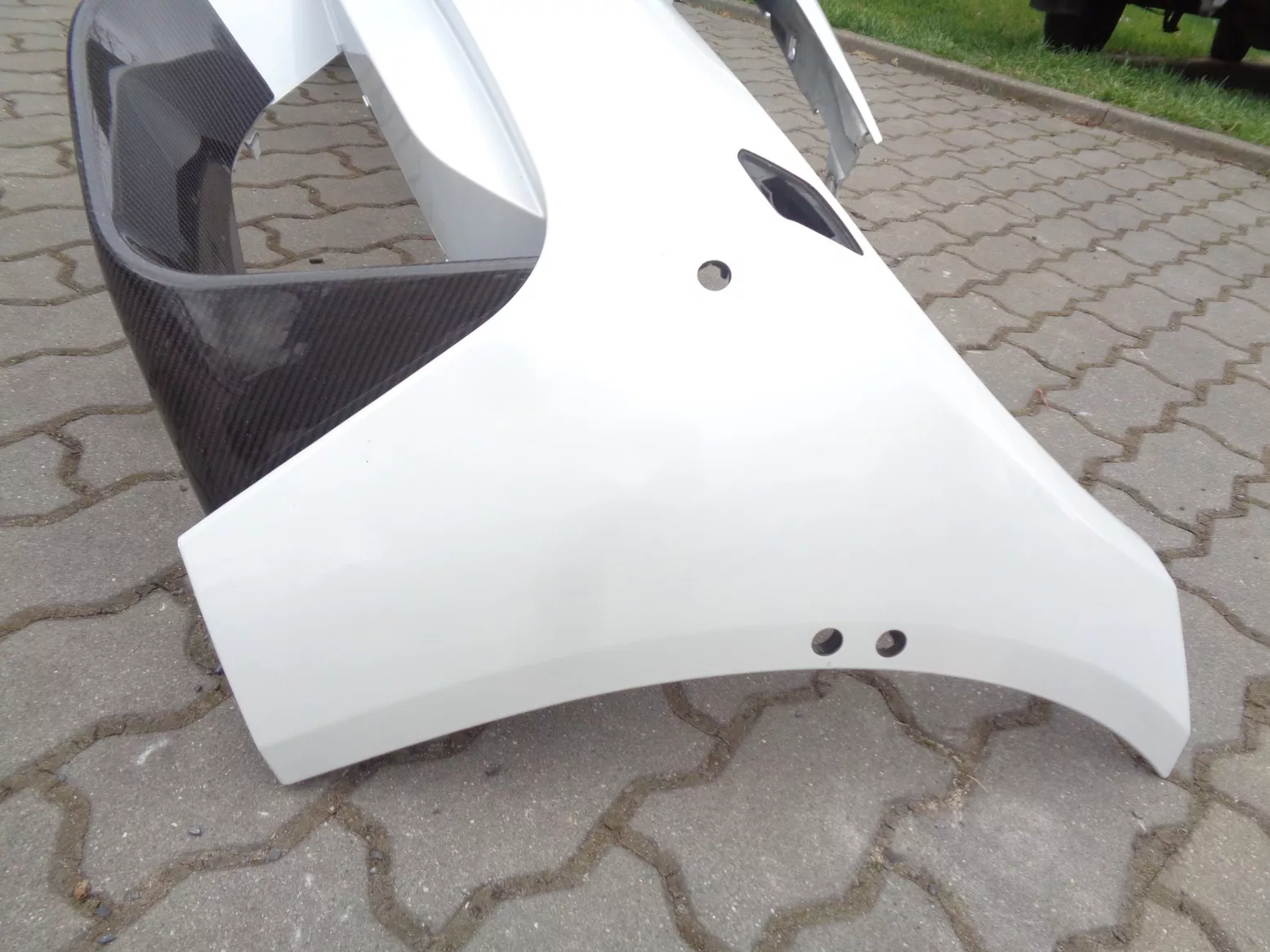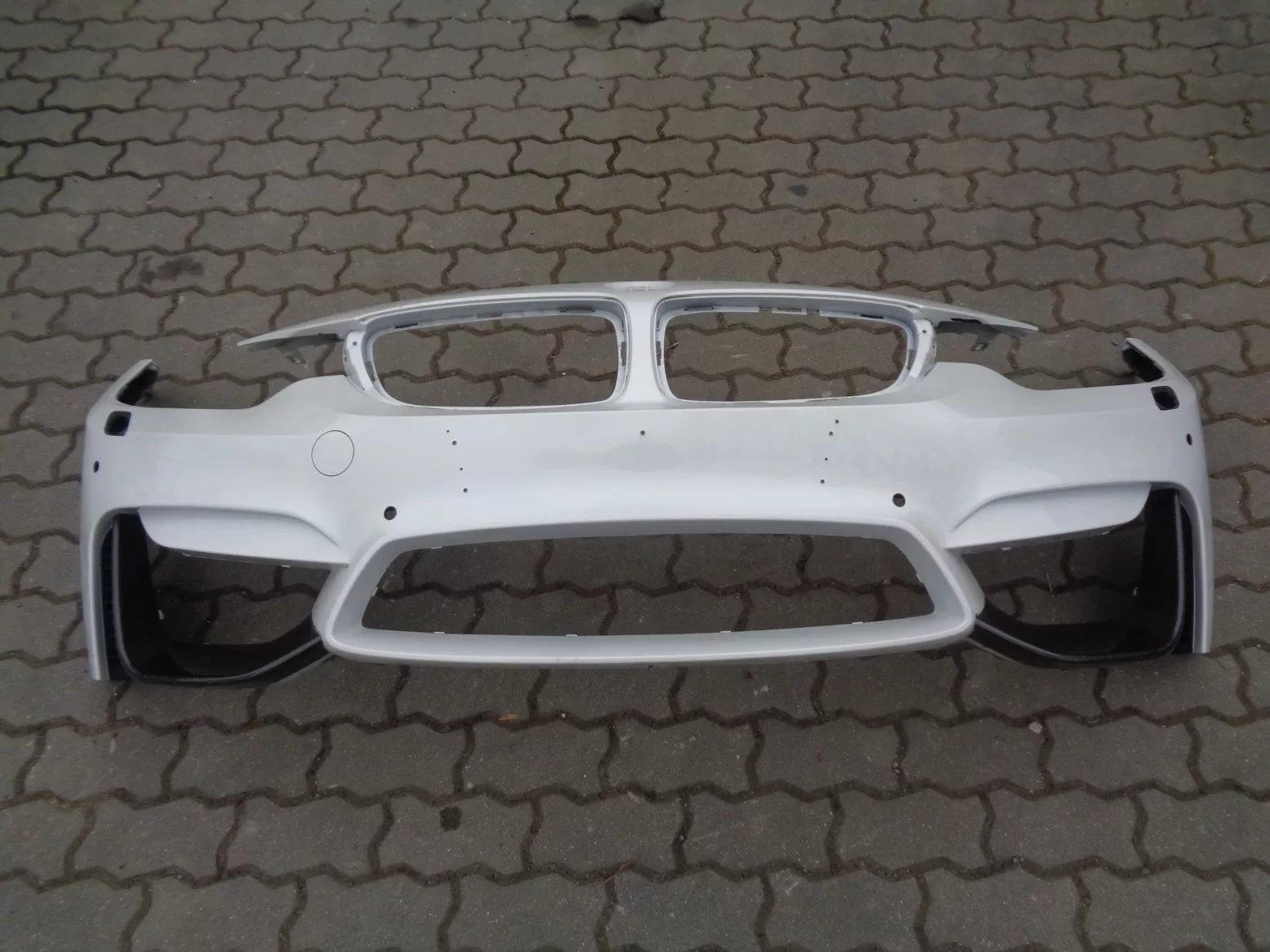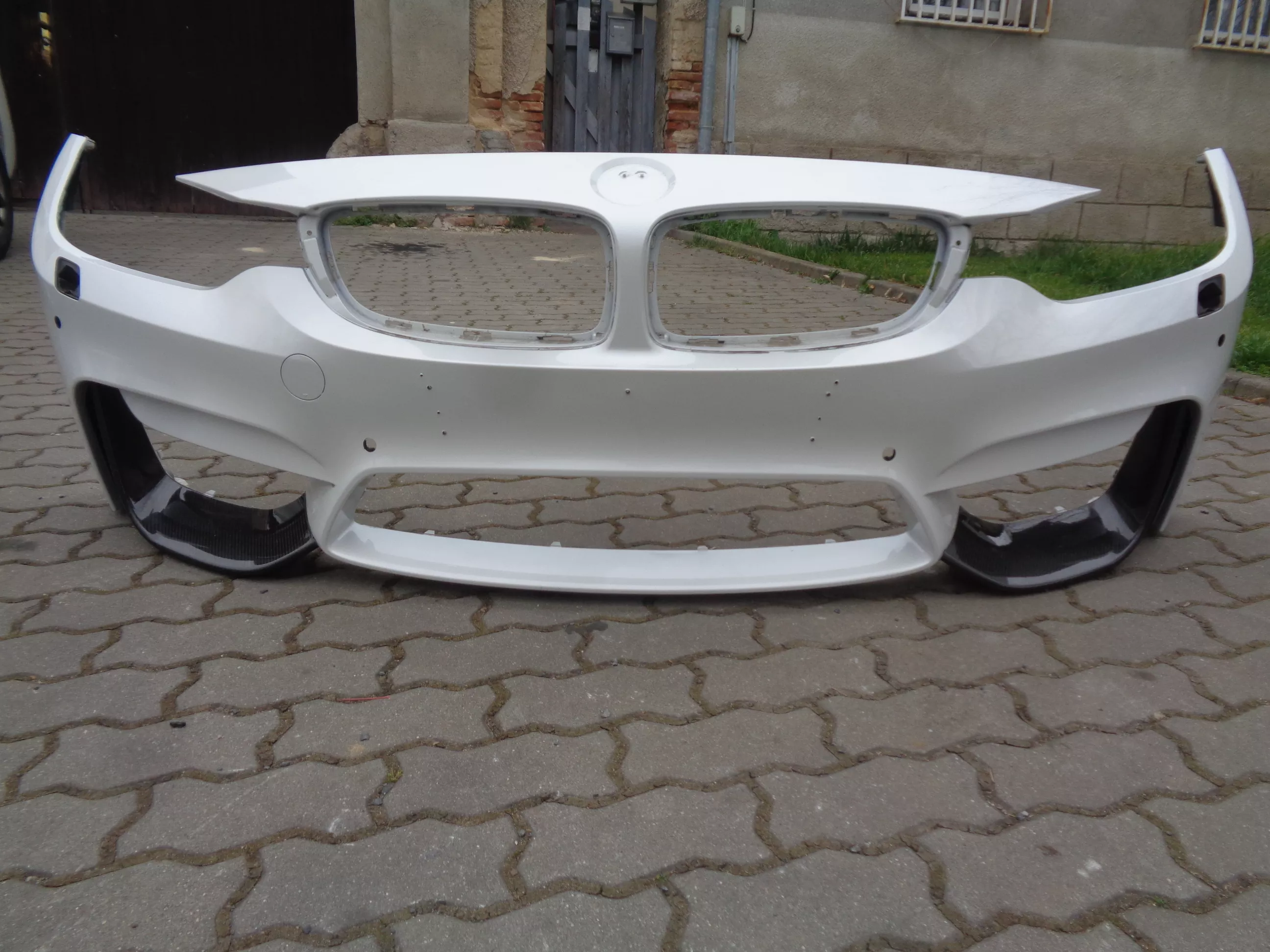 Originál přední nárazník na BMW M3 F80 a BMW M4 F82/83, otvory na ostřikovače, PDC, PMA a SVC, bílá metalíza - Mineralweiss, perfektní stav, jen oděrka laku na pravé spodní hraně. Cena včetně bočních karbonových nástavců (střední nemám).